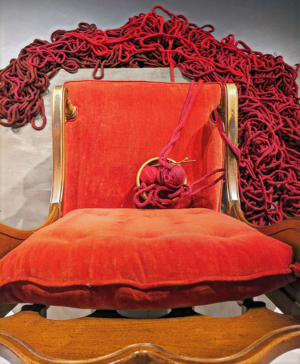 In the second version, the crochet hook and chain are still connected to the ball of yarn, which rests atop a dark red, floral-patterned armchair. The chain cascades down, pooling around the chair in a tangle. This installation invites the audience to sit in the rocking chair and actively continue the work of creating the chain. The chain travels with me from errands to the doctor’s office to work, symbolizing not only the physical aspects of invisible labor but also the mental load women carry. As I juggle these tasks, the act of crocheting serves as a grounding practice amidst the chaos.​